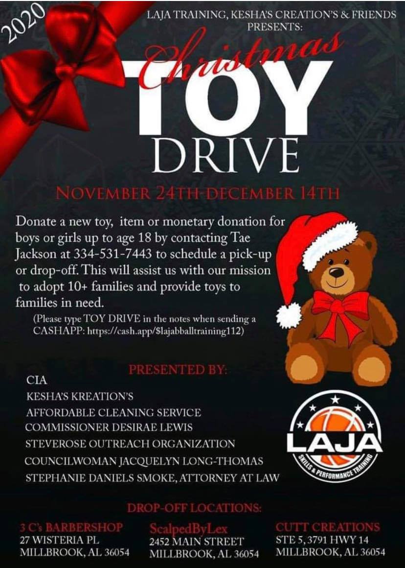 Donate a new toy, item or monetary donation for boys or girls up to age 18 by contacting Tae Jackson at 334-531-7443 to schedule a pickup or drop off. This will assist them with their mission to adopt families and provide toys to families in need.
