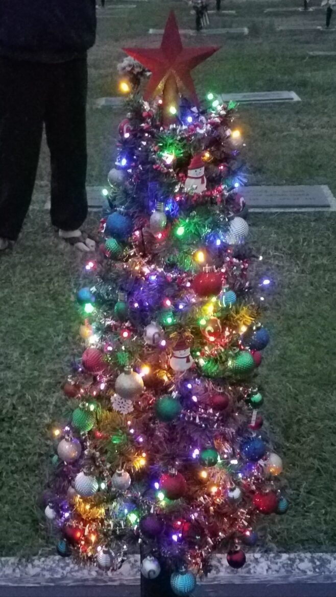 “This is a picture of the Christmas tree my wife spent hours of her time decorating for her daddy’s gravesite. A lot of love, money and pain and suffering due to health problems went into this tree. Some low life decided they needed the tree more than her daddy did. She would have gotten one for you if you needed it that bad. Putting flowers on his grave is the only thing she has left that she can do for him. The money it costed is not the issue.