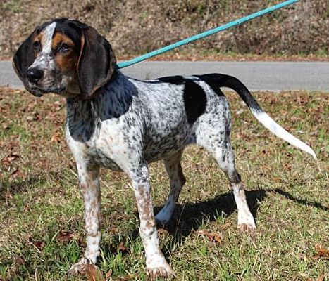 Millie is a 6-month-old female Bluetick Coonhound who must be spayed before she is adopted. She came to PAHS as an owner turn in because she was not good with her owner’s young children. Millie is gorgeous with the classic bluetick hound coloring and markings of a basic white coat with black ‘ticking’. Her coat color is white, with a thickly mottled body, with various shaped black spots on her back, ears and sides giving Millie a speckled-blue look.
