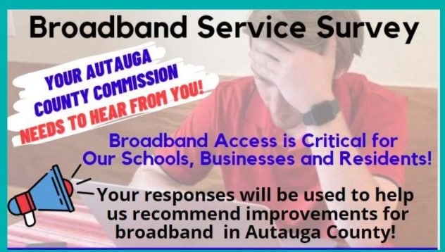 Your Autauga County Commission needs to hear from you to gain a better understanding of broadband (high-speed internet) needs and opportunities for business, education, health, safety and residential uses in Autauga County!