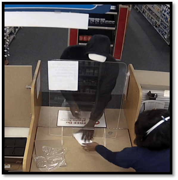 On Jan. 18, 2021 at approximately 6:50 p.m., the Prattville Police Department responded to the CVS/Pharmacy located at 1904 Cobbs Ford Road in reference to a Robbery call.  At the time of the robbery, an unidentified black male produced a written note and demanded narcotics, including OxyContin, Hydrocodone and Xanax.