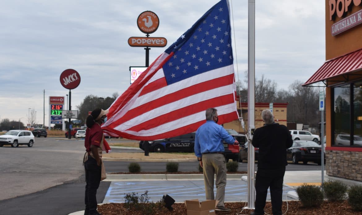 Just as the crowd was dispersing a package came, which was an American Flag. It was immediately placed on the flagpole by employees and will proudly wave at the store.