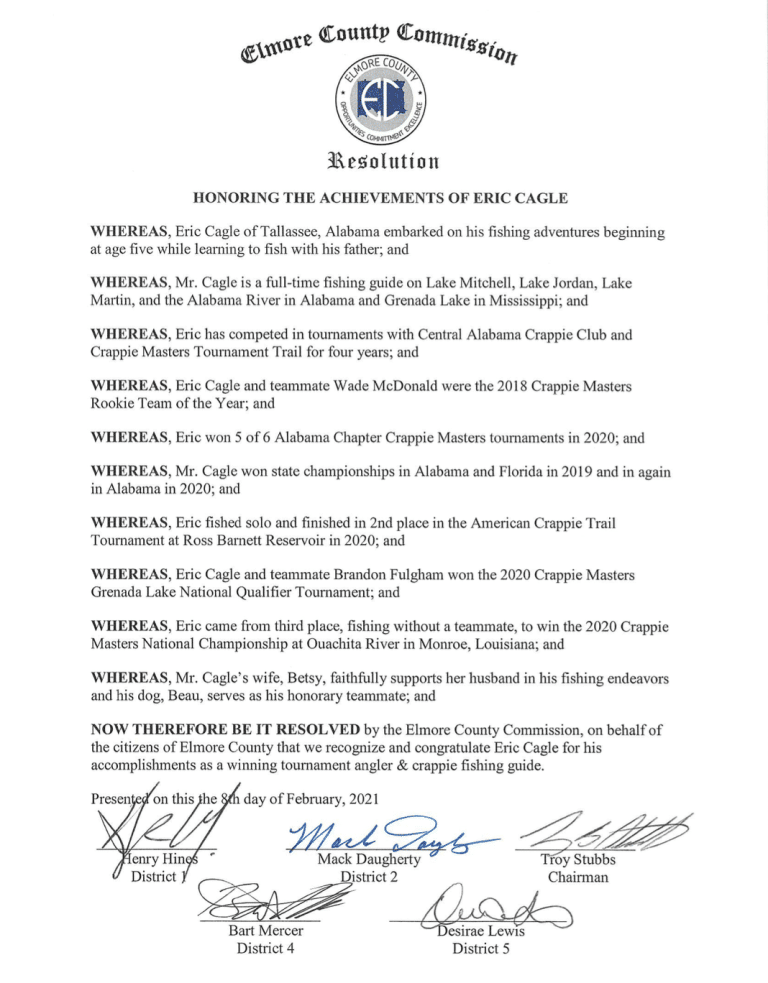 The Elmore County Commission recognized Tallassee resident Eric Cagle at their regular meeting this week, for his 2020 Crappie Masters National Championship status.