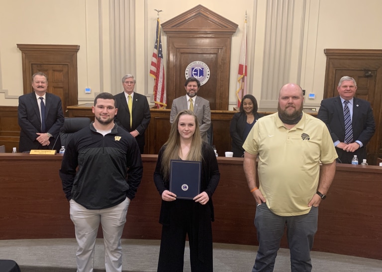 “I think it is a testament to the commitment of our school system to student athletes,” Stubbs said. “And we are excited to have the privilege to recognize the first ever AHSAA girl’s wrestling champion in the 150-pound weight class, Miss Jade Eldridge.”