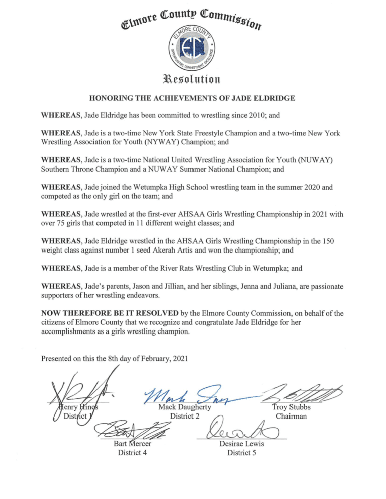 On Monday night the Elmore County Commission recognized Jade as the first-ever AHSAA Girls Wrestling Champion of 2021, after she competed recently with 75 other girls in 11 different weight classes. The event was held at Hoover High School January 23.
