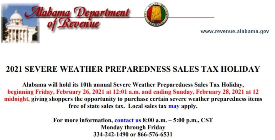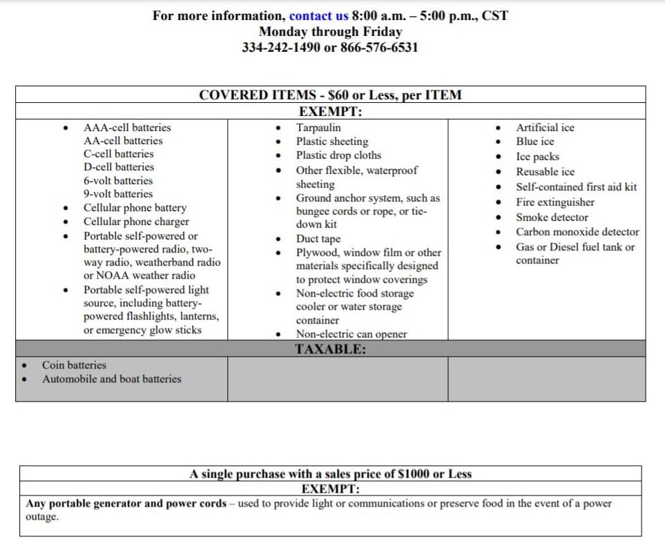 Some of the tax-free items are common supplies costing less than $60 than can be used to prepare for a natural disaster or other emergencies. For more information about tax free items click https://revenue.alabama.gov/wp-content/uploads/2017/05/WPHolidayQuickRefSheet21.pdf