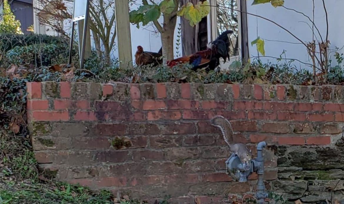 One of the photos I have included with this story speaks volumes! Look at it and you will see the rooster. Just below him, you’ll see some sort of natural gas apparatus. I took this photo myself and did not notice until later the squirrel sitting on top of it. In an attempt to coax the rooster closer, I tossed out a handful of those greasy fries I had been eating. That’s when I noticed the squirrel. He was off that pipe and on those fries like ugly an ugly gorilla! Then he was up that sketchy looking tree you see on the right. The rooster never made a move. I guess he knew better than to eat those greasy fries!
