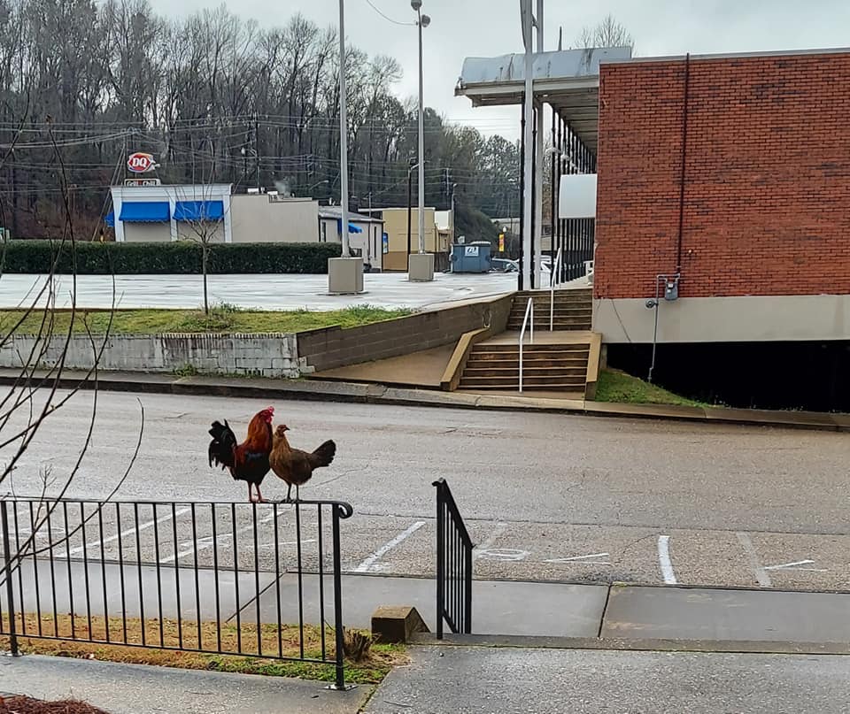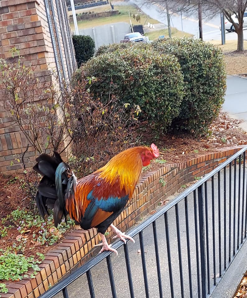 “Hey FB friends! There’s a rooster living near the library in Wetumpka!! Anybody know his name?”