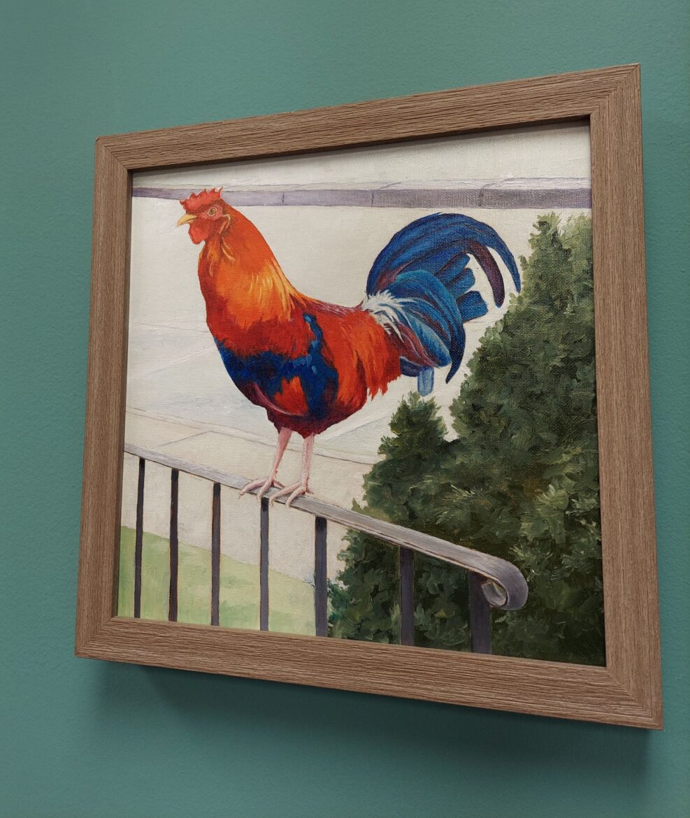 Local artist Judie Hooks felt inspired and now rooster “A” is immortalized on canvas. The painting can be seen hanging in the library. When asked why she painted a portrait of the “A” rooster, Judie said “He was more colorful…” However, Rooster “B” could not be reached for comment.