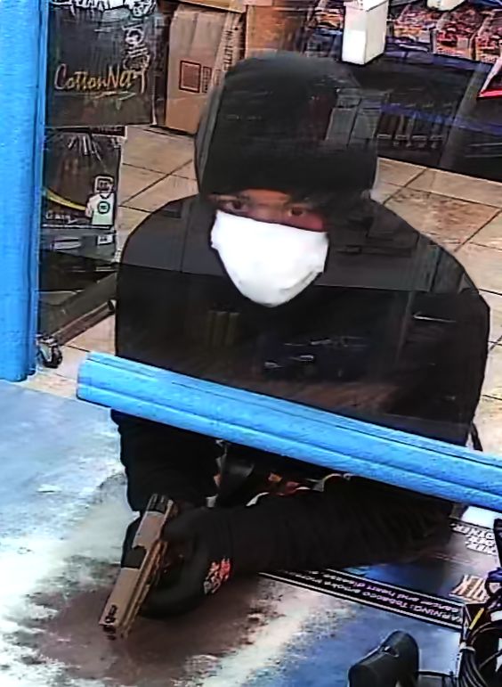 On January 25, 2021 at approximately 6:45 am, two unknown males driving a 2016 to 2018 black Kia Forte drove onto the parking lot of the Corner Store located at the corner of Alabama Highway 125 and US 231.  Both males entered the store, the first male, pointing a solid black semi-automatic handgun, ordered the clerk down behind the counter and demanded money. The second male, brandishing a tan and black handgun, went to the liquor side of the convenience store and started removing liquor.