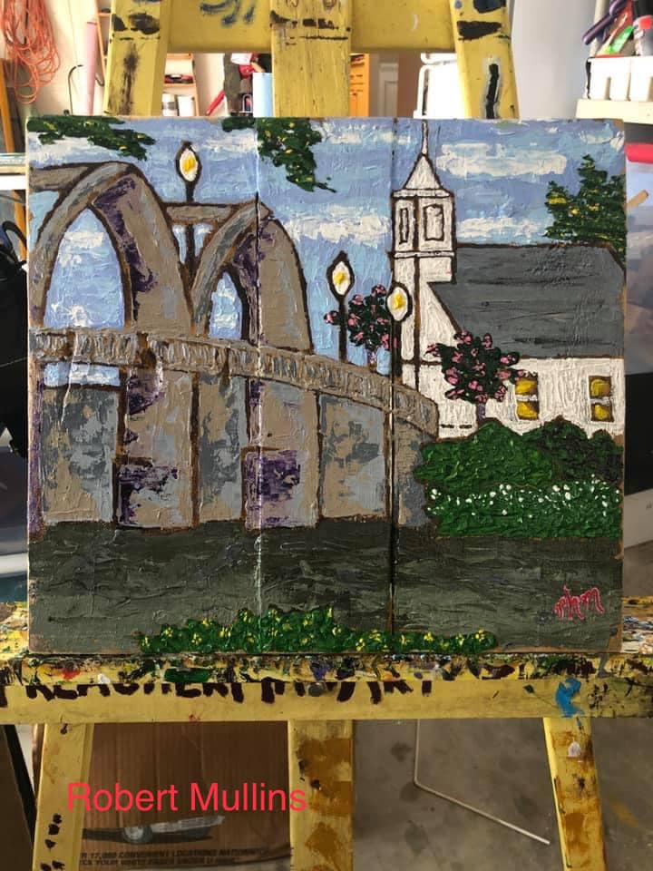 Mullins builds canvasses from reclaimed wood and draws familiar objects such as Wetumpka’s Bibb Graves Bridge and Samford Hall at Auburn.