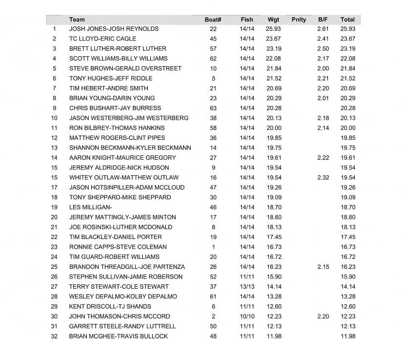 After starting with 80 teams, the filed was cut to 50 yesterday and was once again cut to 25 today. Conditions for the tournament have been tough for many competitors, as the rising Alabama River has made the water murky – scaring many fish away.