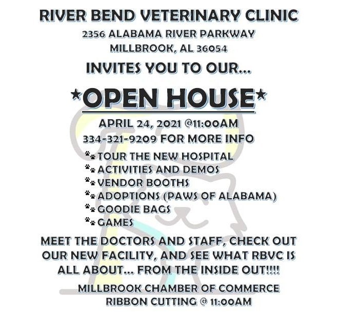 The River Bend Veterinary Clinic is located at 2356 Alabama River Parkway. The community is invited to the Open House which begins at 11 a.m. For more information, you can call 334 321-9209.