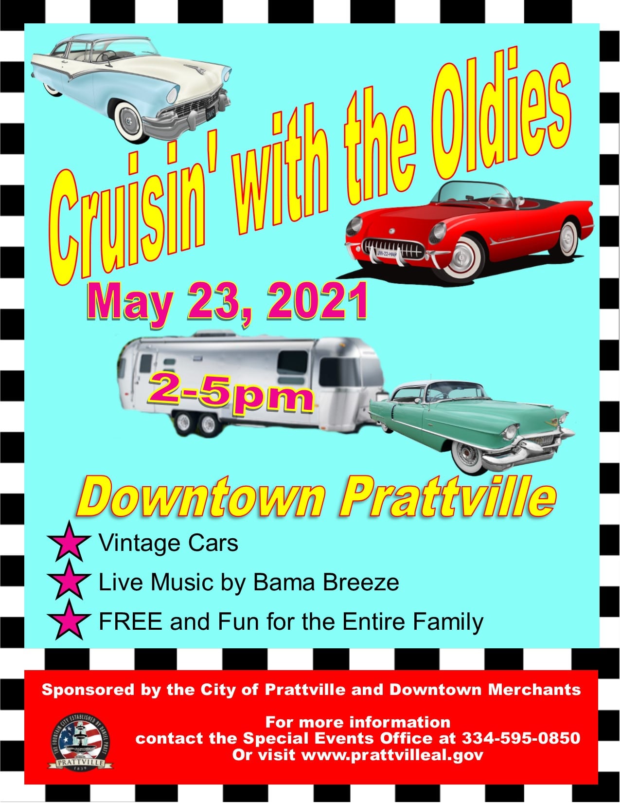 The City of Prattville and downtown merchants are excited to announce a great event for the whole family. Get ready for Cruisin’ with the Oldies on Sunday, May 23, with vintage cars and live music. Baby boomers will enjoy reminiscing about the good old days while they check out the vintage mustangs, corvettes, and other vintage cars. Young and old alike will be dancing in the aisles to tunes from Bama Breeze.
