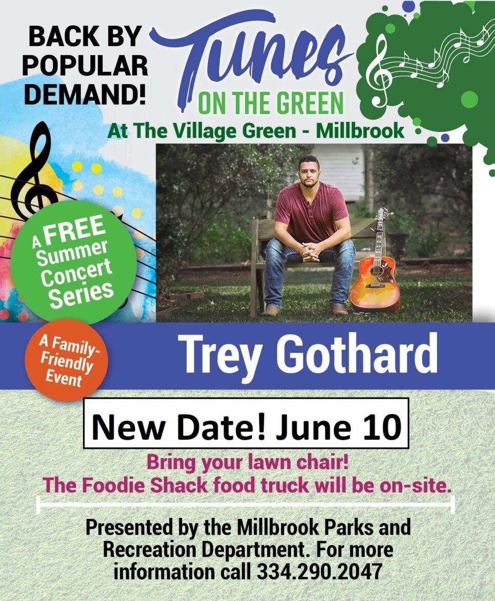Mother Nature didn’t play nice Thursday, for the first in the Millbrook Tunes on the Green concert Series. However, a new date has been chosen for June 10 at Village Green park with local musician Trey Gothard.