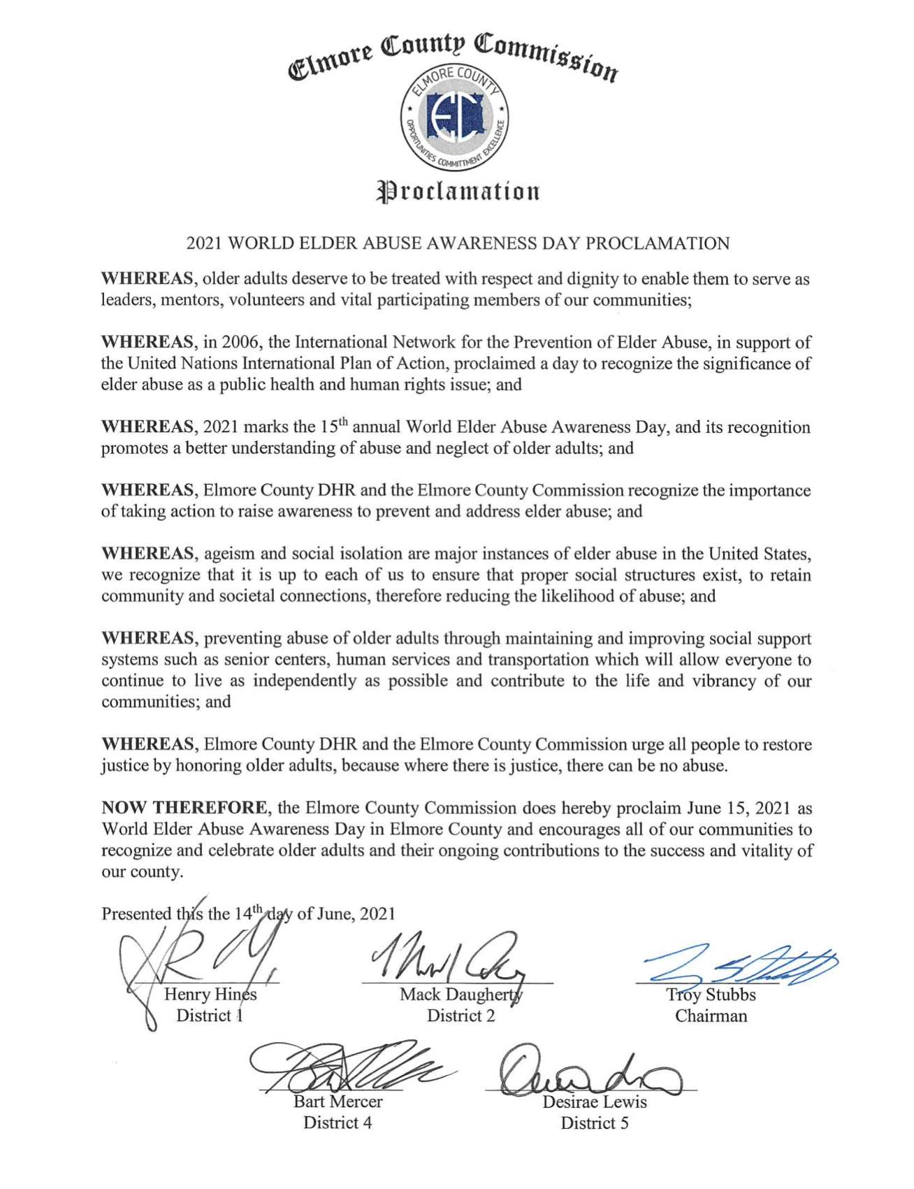 County Commission Signs Proclamation for World Elder Abuse Awareness Day June 15, 2021 FROM THE ELMORE COUNTY COMMISSION During the June 14, 2021 County Commission meeting, the County Commission signed a Proclamation declaring June 15, 2021 as World Elder Abuse Awareness Day.