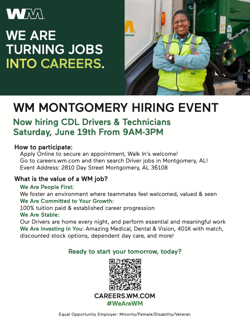 Waste Management is looking for new employees and will host a Hiring Event Saturday, June 19 from 9 a.m. to 3 p.m. The event will be held at 2810 Day Street in Montgomery.