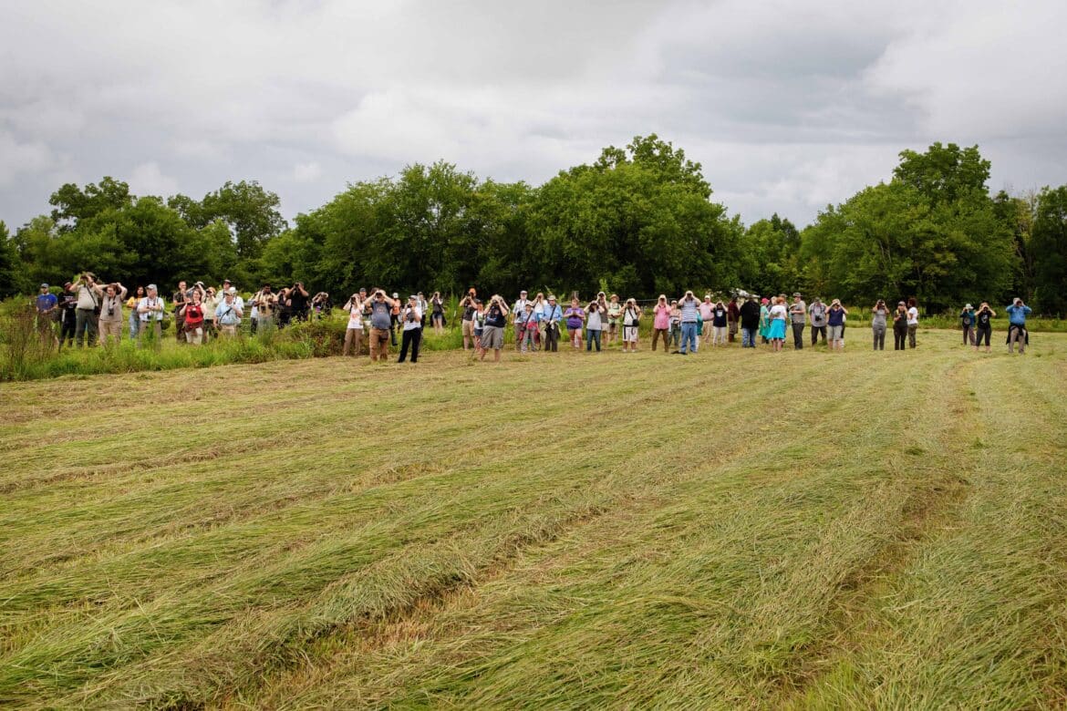 Top Photo: Attendees watch for birds in a freshly mowed field at the Joe Farm.