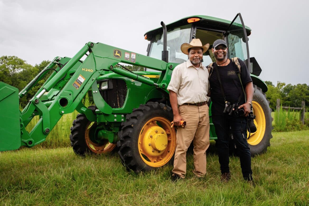 Cornelius Joe (left), owner of the Joe Farm, and Dr. J. Drew Lanham, author, poet, and Professor of Wildlife Ecology at Clemson University, pose in front of a tractor at the Joe Farm.