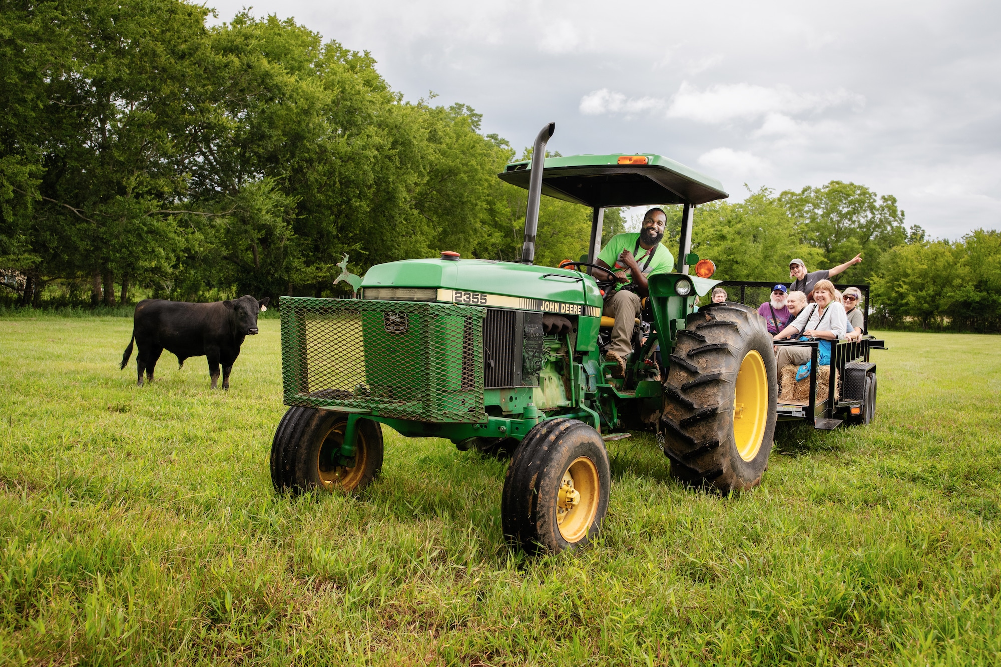 Christopher Joe, owner of Connecting with Birds and Nature Tours, LLC, drives a tractor to shuttle attendees around the Joe Farm.