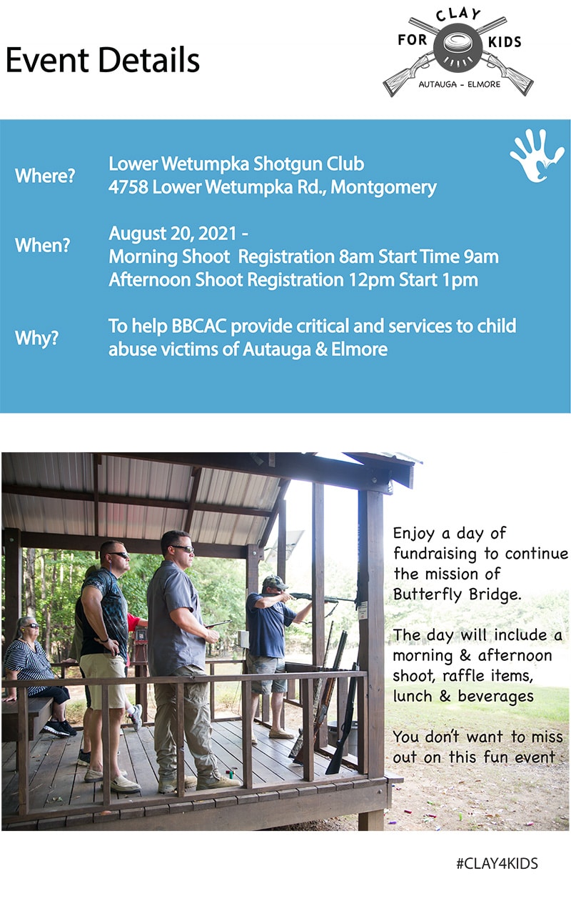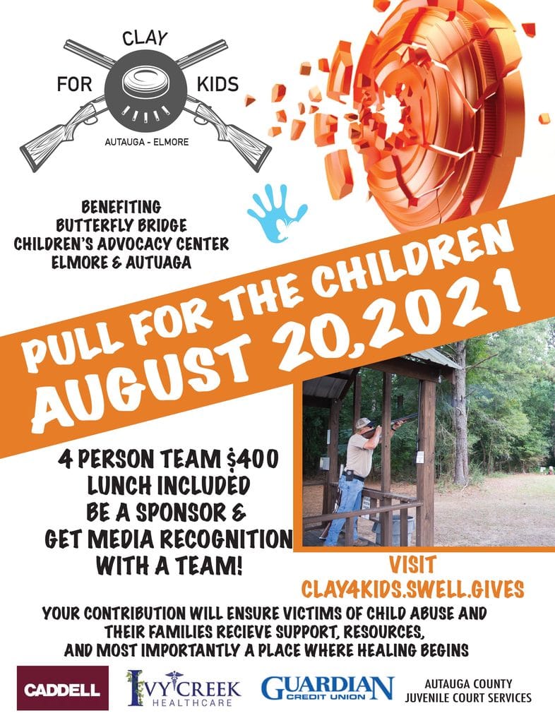 The Clay For Kids Event for Autauga and Elmore Counties benefits the Butterfly Bridge Children’s Advocacy Center. On Aug. 20, 2021 you can “Pull For The Children.” The cost for a four person t4eam is $400 with lunch included. You can be a sponsor and get media recognition with a team.