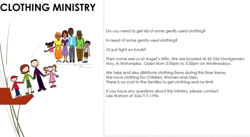We take and also distribute clothing items during this time frame. We have clothing for Children, Women and Men. There is no cost to the families to get clothing and no limit.