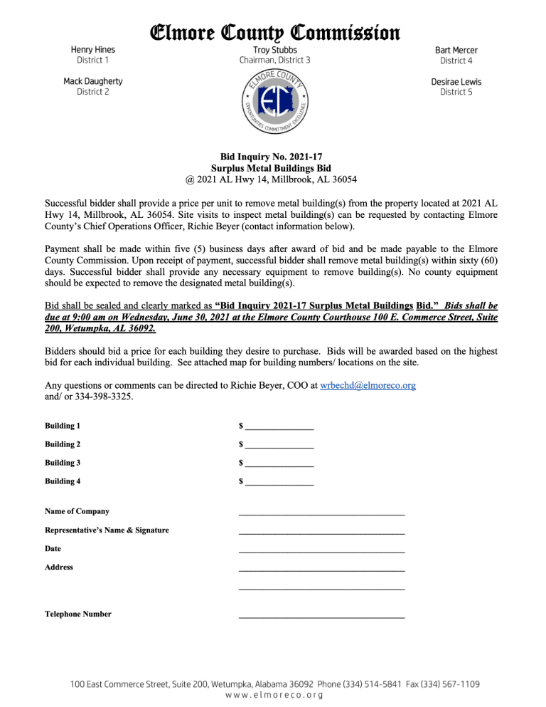 REMINDER: Elmore County and the City of Millbrook Receiving Bids for Surplus Metal Buildings
