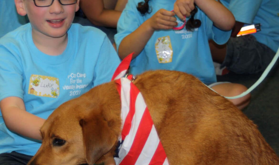 Children were petting and snuggling doggies of many sizes and breeds Tuesday when “Dogs on Call” brought seven therapy dogs to the second day of the Tri-County Camp for the Visually Impaired.