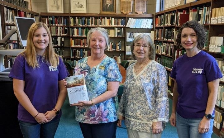 On July 22, 2021 officers of the General Patrick May Chapter, U.S. Daughters of 1812 donated the book Early Alabama: An Illustrated Guide to the Formative Years, 1798-1826, by Mike Bunn, to the Autauga/Prattville Public Library. Mary Buehler and Barbara Russell presented the book to Library Director, Lindsey Milam, and Library Associate, Rachel Ellison.
