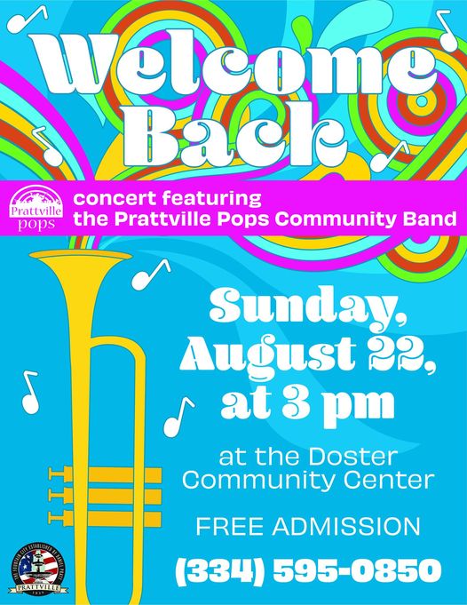 The City of Prattville is excited to announce a concert by the Prattville Pops on Sunday, August 22. This concert, titled “Welcome Back,” will be their first concert since the COVID19 pandemic shut down these types of events more than a year ago. The FREE event will be held at the Doster Community Center.