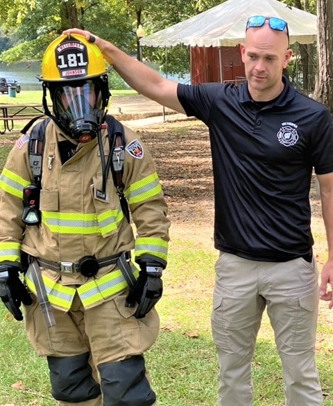 Jon Johnson and another fireman both brought out their full turnout gear. Lieutenant Jake Baker with the Wetumpka Fire Department is the coordinator for the school programs. He talked about how children sometimes get upset when they see a fireman in their full turn out gear, but he wanted to reassure the children that they do not have to be afraid.