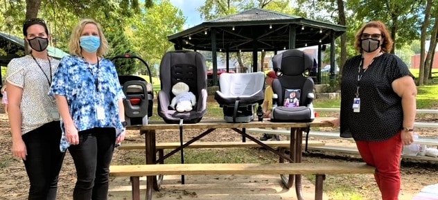 The Alabama Department of Public Health had three employees that came out to the group meeting to demonstrate to the parents on how to properly buckle a child in a car seat as well as a booster seat. Denise Bertaut is the program coordinator for the Alabama Department of Public Health. Betsy Cagle and Bertaut are both certified car seat technicians.