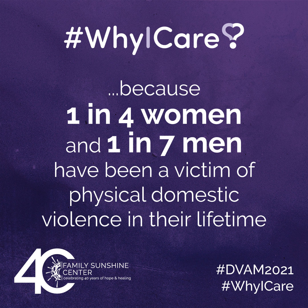 Graphic from The Family Sunshine Center – Why should you care about domestic violence? Someone you care about is likely experiencing #DomesticViolence, whether you can see it or not. 1 in 4 women and 1 in 7 men will experience severe physical violence from an intimate partner in their lifetime. #DVAM #WhyICare