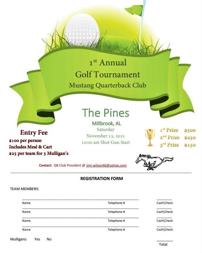 The Mustang Quarterback Club of Millbrook is hosting an inaugural Golf Tournament at the Pines Golf Course Saturday, Nov. 13. There will be a 10 a.m. shot gun start.