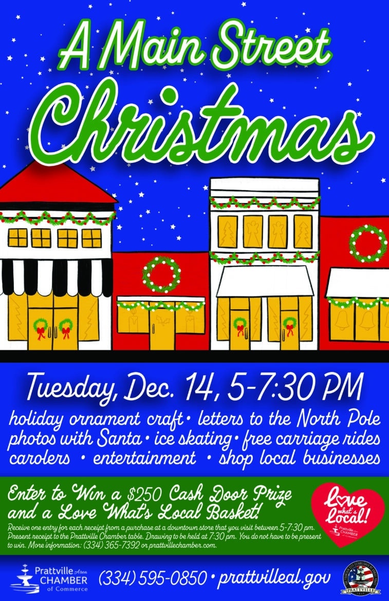 The City of Prattville will be dressed up and ready to greet you and your family and friends at the 6th Annual A Main Street Christmas event on Tuesday, December 14, in the historic Downtown District from 5:00-7:30 p.m. We are excited to partner with the Prattville Area Chamber of Commerce and the merchants of downtown again this year for this fun, family-friendly event.