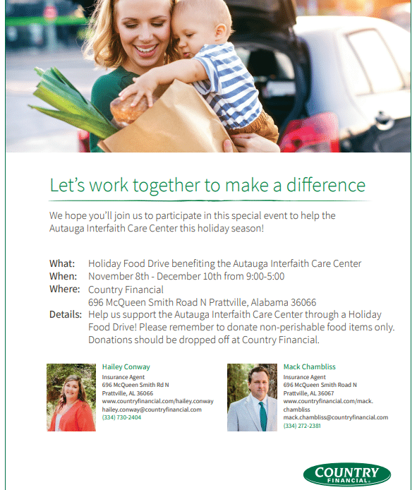 Chambliss’s office is currently conducting a Holiday Food Drive to benefit the Autauga Interfaith Care Center. Donations will be accepted through December 10 at the company’s office at 696 McQueen Smith North in Prattville. Donations should be non-perishable food items only.