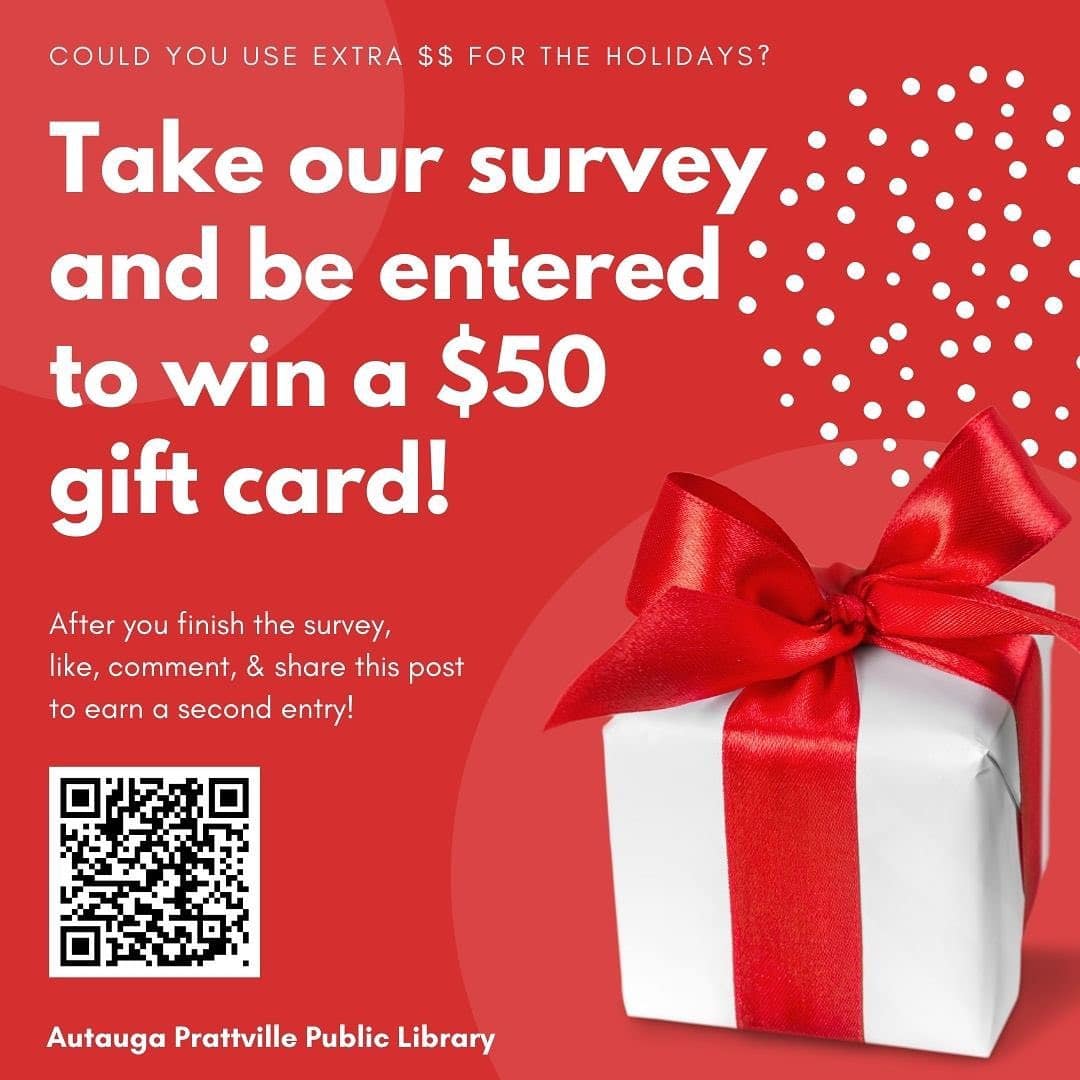 Fill out a survey for the Autauga Prattville Public Library and your name will be entered to win a $50 gift card. Once you complete the survey, like, comment and share the post to earn a second entry! Please visit the original post on the Autauga Prattville Public Library Facebook page to ensure you get credit for liking, commenting and sharing.