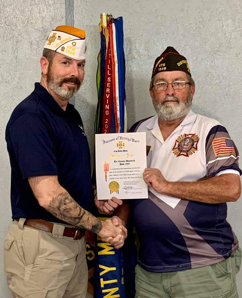 During our October Membership Meeting, District 5 Commander DJ Jones presented a certificate and flag streamer, recognizing Tri-County Memorial VFW Post 1349 as an “All American Post” for 2020-2021.