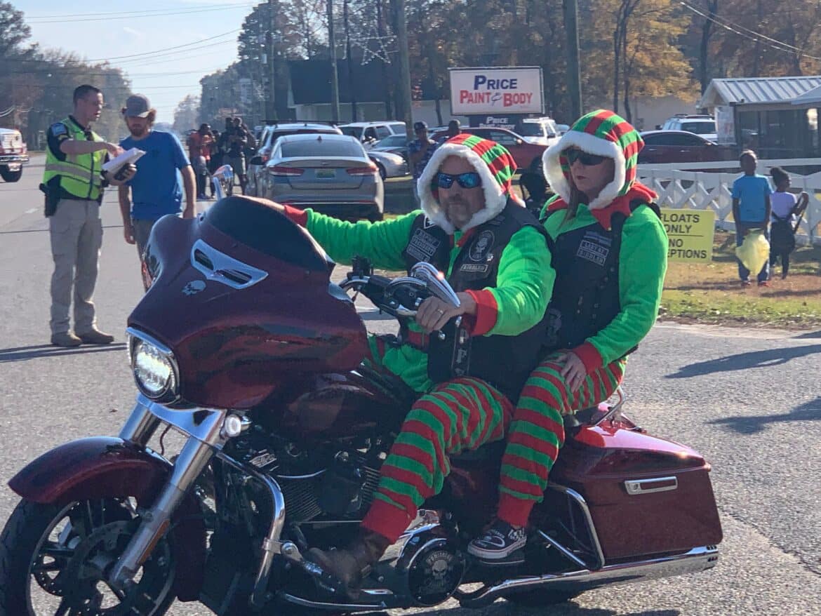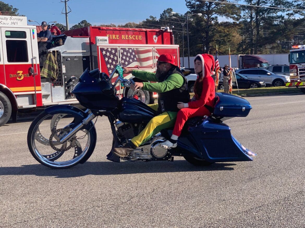 Leading the parade were members of area motorcycle groups and organizations, some dressed as elves or in colorful Christmas attire. After a few minutes, the main body of the parade made its way slowly down Main Street, with Grand Marshal Joseph “Rabbit” Culver and his wife Nora Jean getting a lot of love.