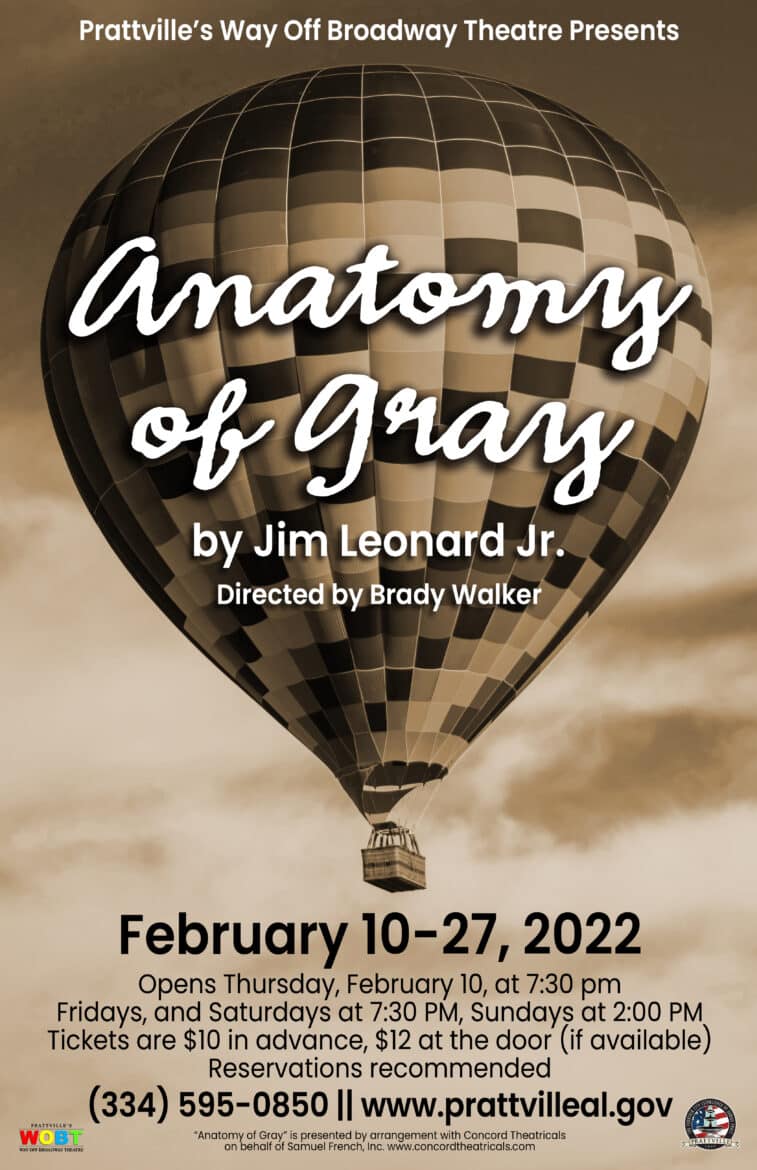 Prattville’s Way Off Broadway Theatre will present The Anatomy of Gray, by Jim Leonard, Jr., February 10-27, 2022.