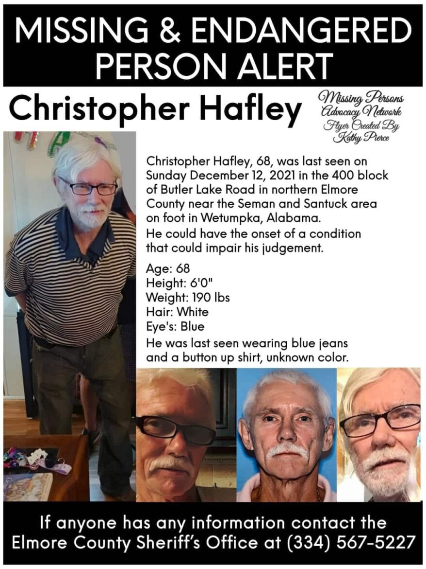 It has now been four weeks since Christopher Hafley, 68, was seen in the 400 block of Butler Lake Road in northern Elmore County near the Seman and Santuck area on food in the Wetumpka area. It is believed Hafley has a condition that could impair his judgement.
