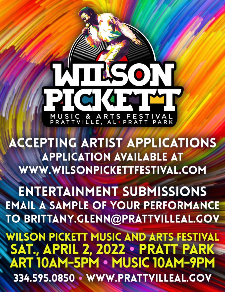 The City of Prattville Special Events Office is accepting artist applications for the 2022 Wilson Pickett Music and Arts Festival which will be held on April 2, 2022. Artists and makers are encouraged to apply.