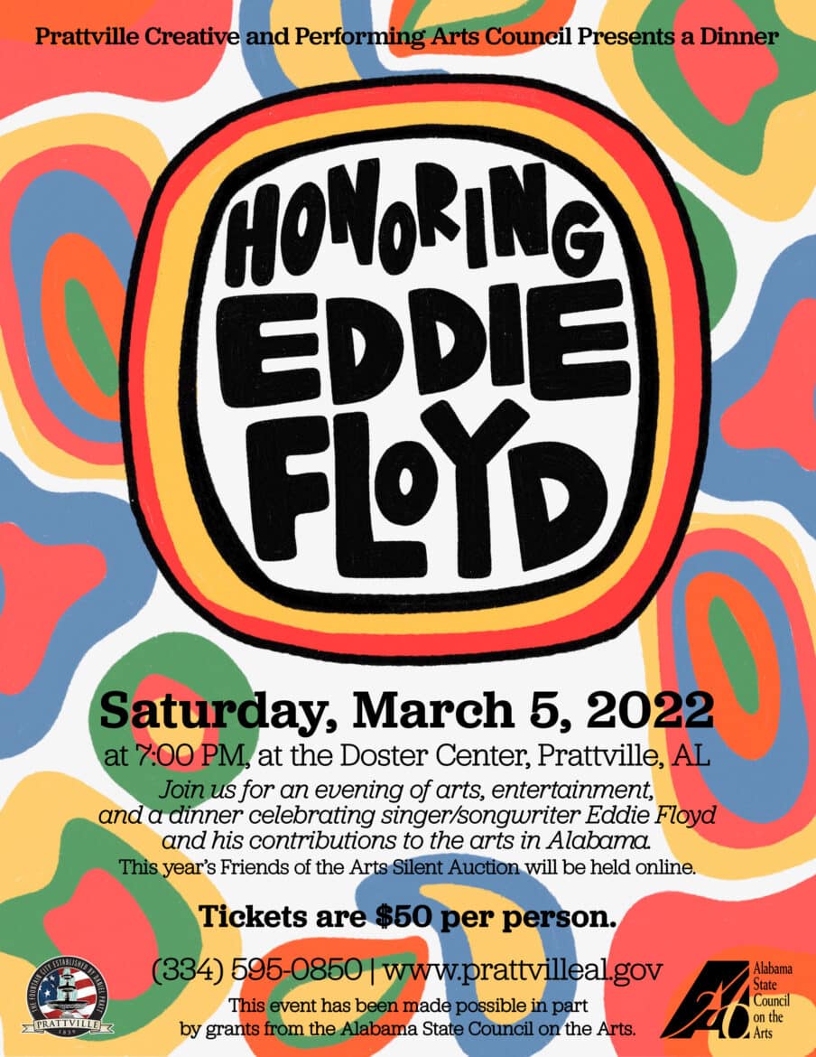The City of Prattville is proud to be hosting its 2022 Honoree Dinner on Saturday, March 5, in honor of Eddie Floyd. Eddie Floyd is a singer and songwriter born in Montgomery, Alabama. From 1957 until 1963, Floyd was a member of the Falcons. Floyd has written and performed several hit R&B songs, including “Knock on Wood,” “Big Bird,” and “634-5789.” He has been inducted into both the Alabama Music Hall of Fame and the National Rhythm and Blues Hall of Fame. In 2020, Floyd turned to a different type of writing and published Knock! Knock! Knock! On Wood, an autobiography.