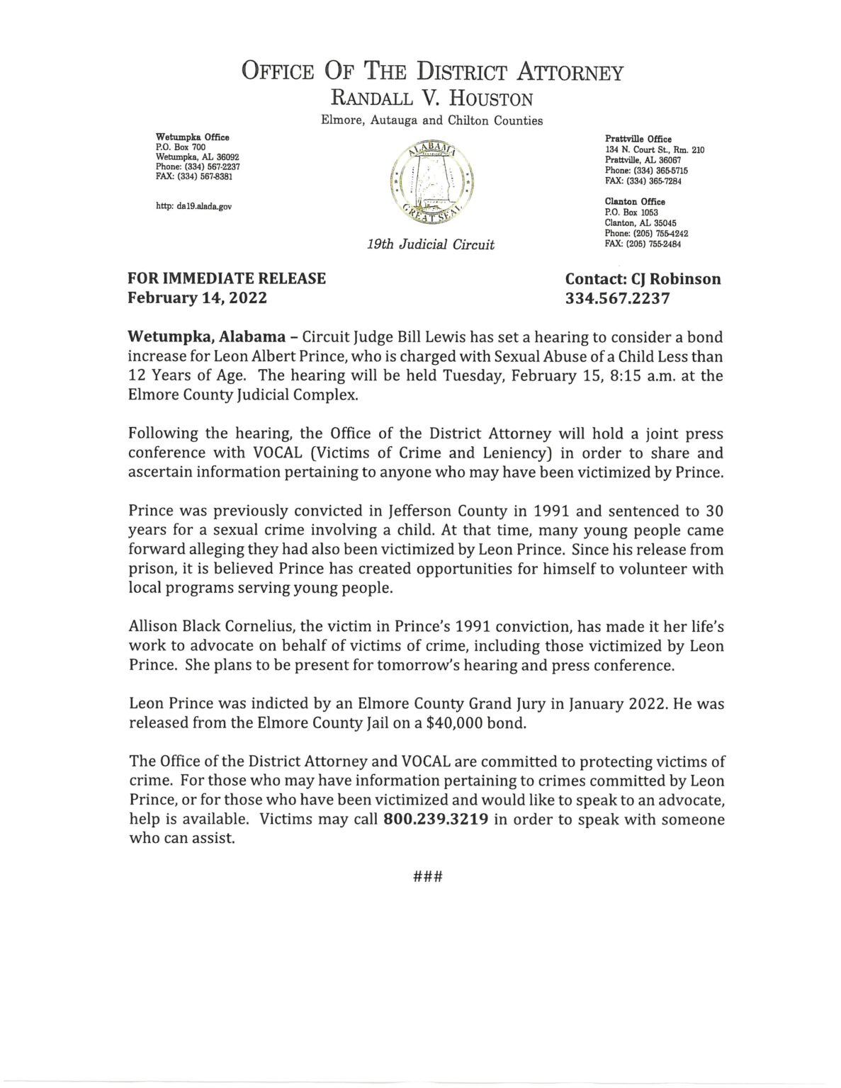 In a release, it states, “The Office of the District Attorney and VOCAL are committed to protecting victims of crime. For those who may have information pertaining to crimes committed by Leon Prince, or for those who have been victimized and would like to speak to an advocate, help is available. Victims may call 800-239-3219 in order to speak with someone who can assist.”