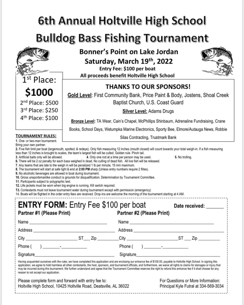 This is the 6th annual Holtville High School Bulldog Bass Fishing Tournament. It will be held at Bonner’s Point on Lake Jordan this coming Saturday, March 19. The entry fee is $100 and ALL proceeds benefit Holtville High.