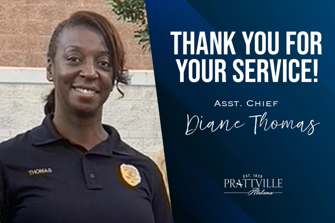 Join us as we recognize and commend Assistant Police Chief Diane Thomas for her 28 years of dedicated service to the City of Prattville and the Prattville Police Department. In 1988, Assistant Chief Thomas began her law enforcement career with Montgomery Police Department, serving a little over three years with MPD.