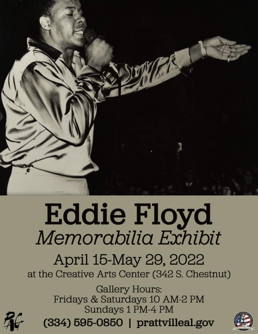 We have a treat for music lovers! An exhibition featuring a collection of memorabilia kindly donated by award-winning singer/songwriter Eddie Floyd will open at the Prattville Creative Arts Center and Gallery on April 15! This collection will be on view through May 29, and gallery hours are Fridays and Saturdays from 10:00 p.m. until 2:00 p.m. and Sundays from 1:00 p.m. until 4:00 p.m.