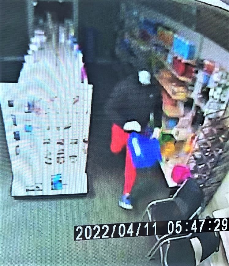 Eclectic Investigators released a photo of the suspect in the act of committing a business burglary. At Approximately 5:45 a.m. on April 11, 2022, the Eclectic Family Pharmacy was burglarized by what appeared to be an unknown male suspect. The suspect was described as wearing red pants, a black hoodie over his head, a white face cover, white gloves, and blue shoes.