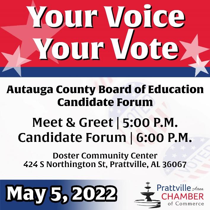 PRATTVILLE, Ala. – The Prattville Area Chamber of Commerce will host a non-partisan Autauga County Board of Education Candidate Forum at the Doster Community Center on May 5. This facility is located at 424 South Northington Street in Prattville.