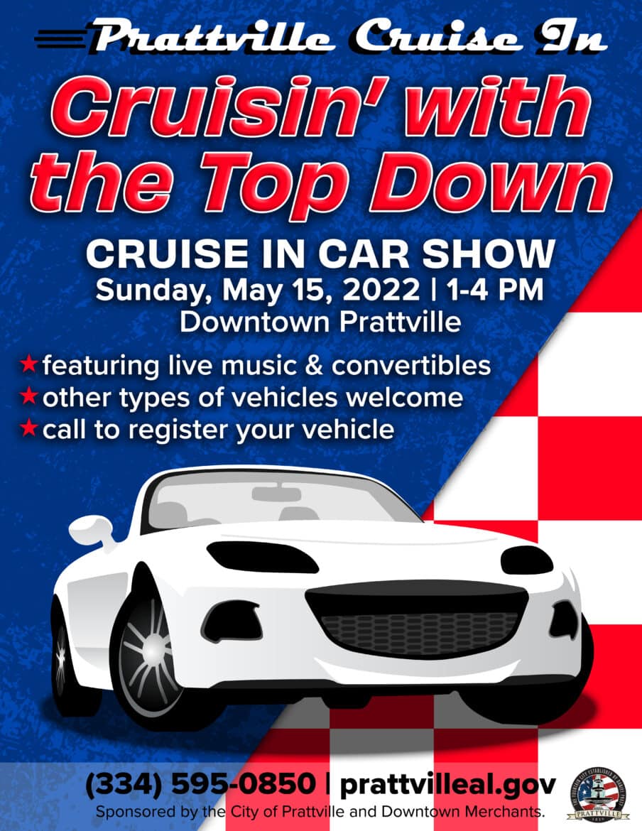 Bring your convertible to Prattville for the “Cruisin’ with the Top Down” car show on Sunday, May 15, from 1:00-4:00 p.m. Convertibles of any make or model are welcome to join in as our featured cars for the May.